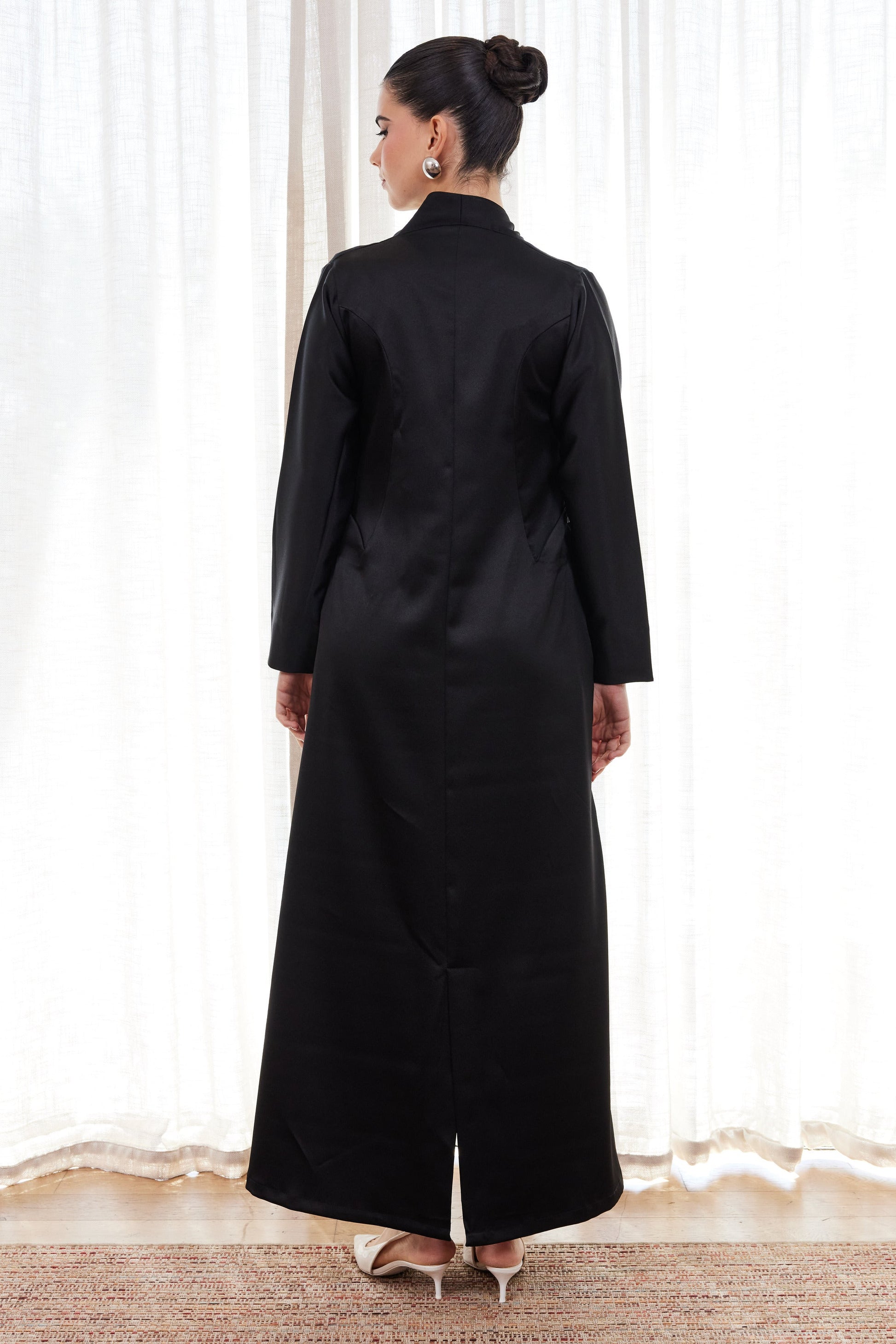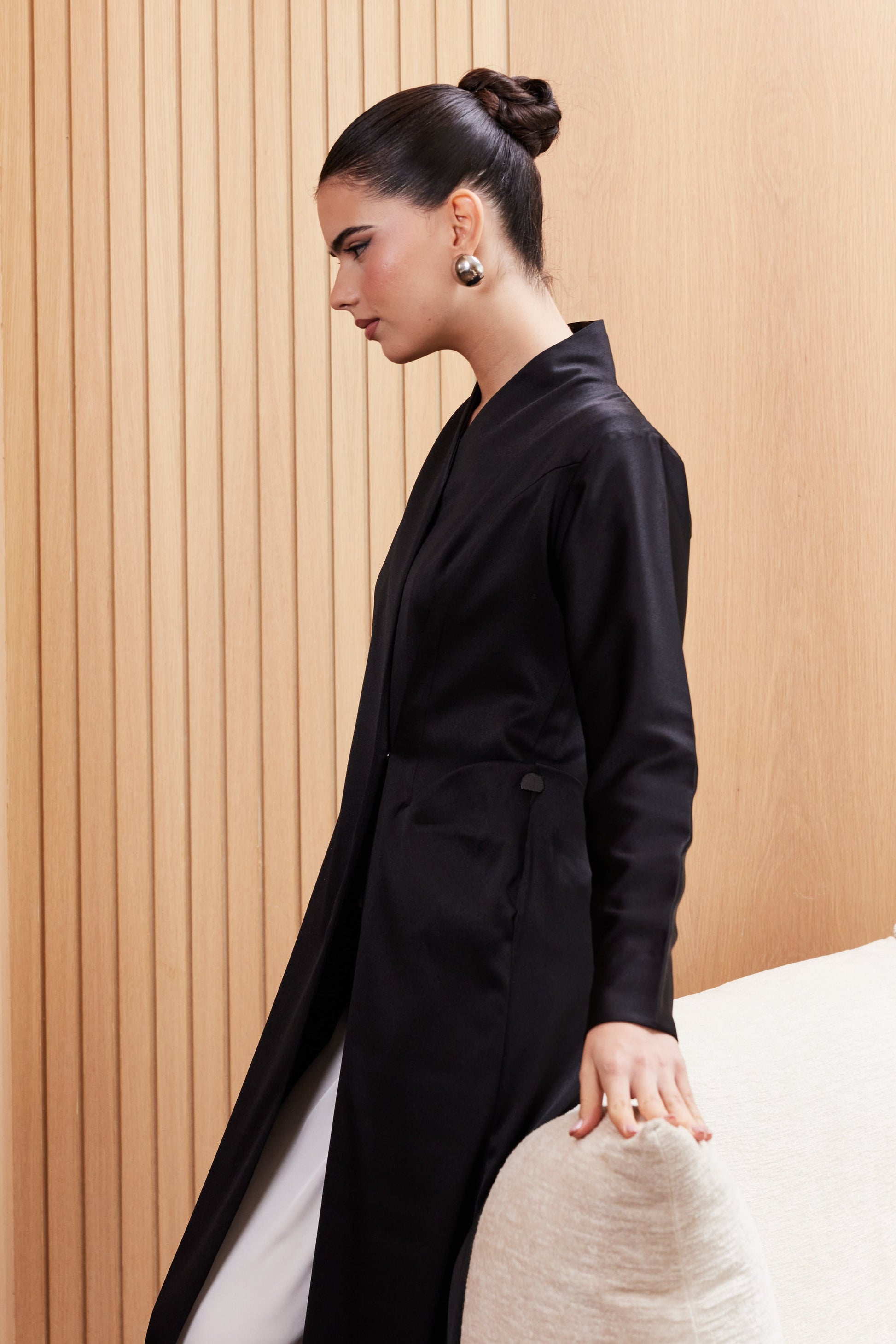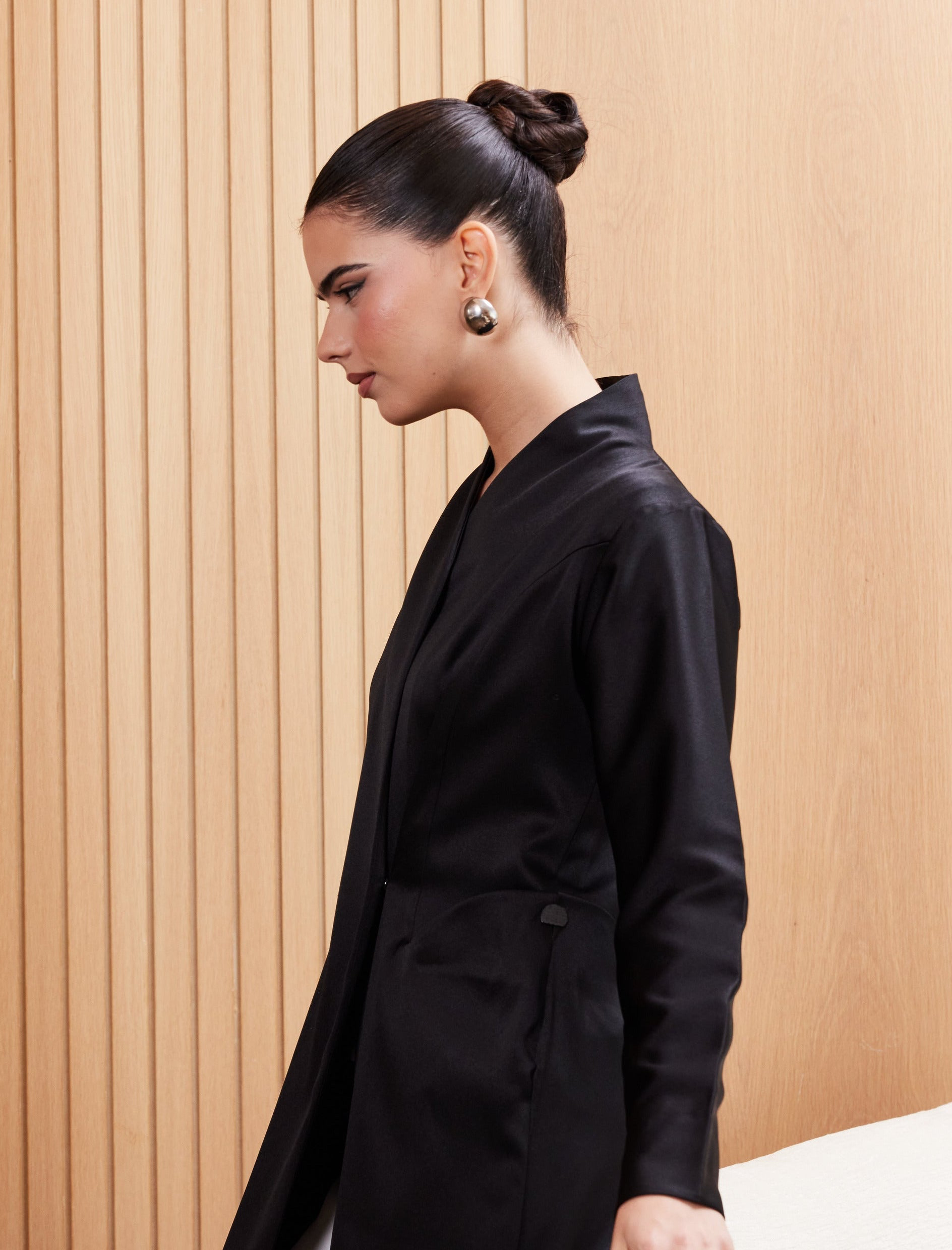 BLACK SILKY CREPE FABRIC IN A WRAP/CLOSED FRONT CUT WITH A UNIQUE DETAIL IN THE SIDE. ROUNDED POCKET WITH A BUTTON MAKING THIS PIECE UNIQUELY MINIMAL