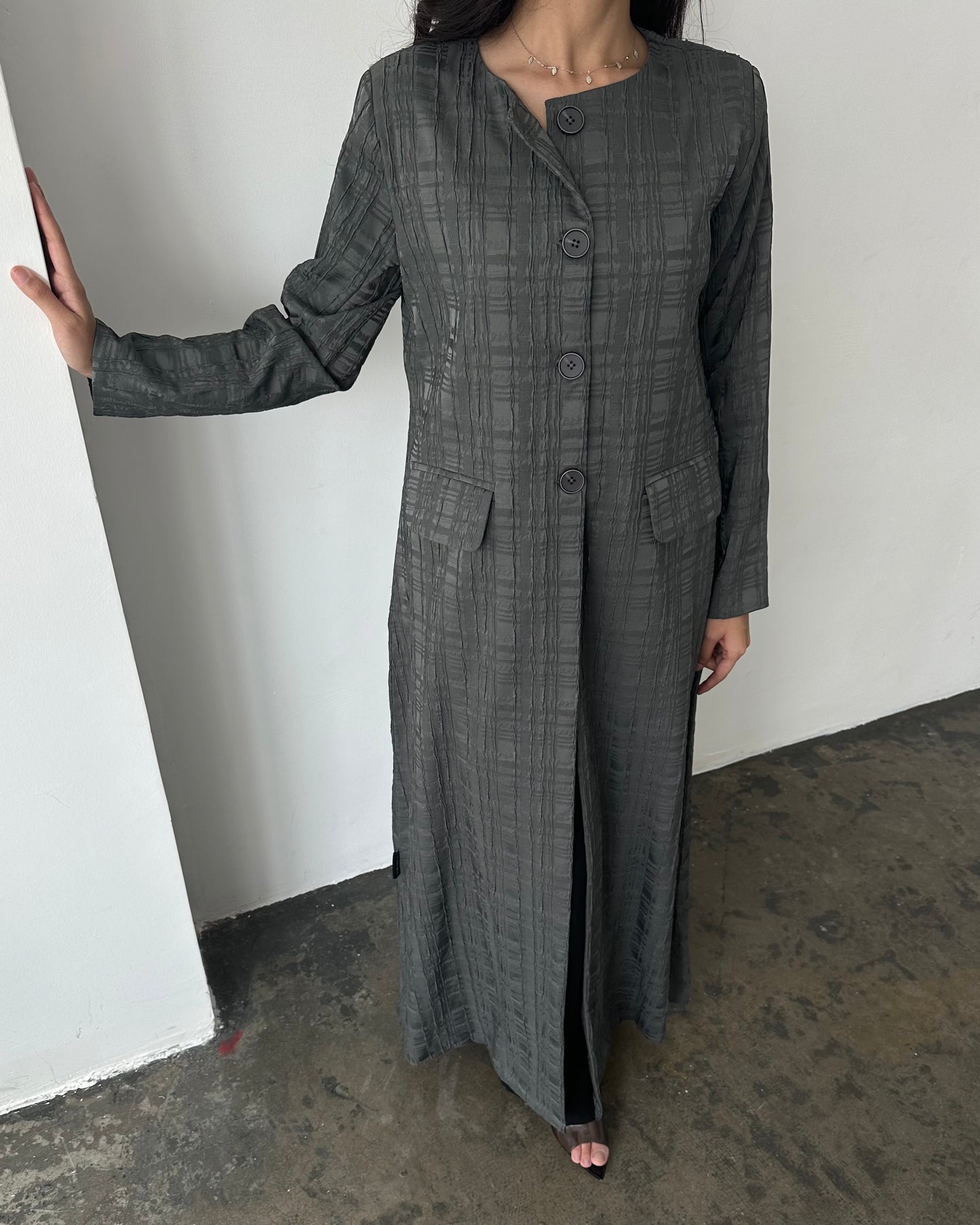In Frame is crafted from grey textured jacquard fabric, offering quiet elegance. Designed in a slight A-line cut, it features four front buttons, hand slits, and front pockets. structured and detailed.