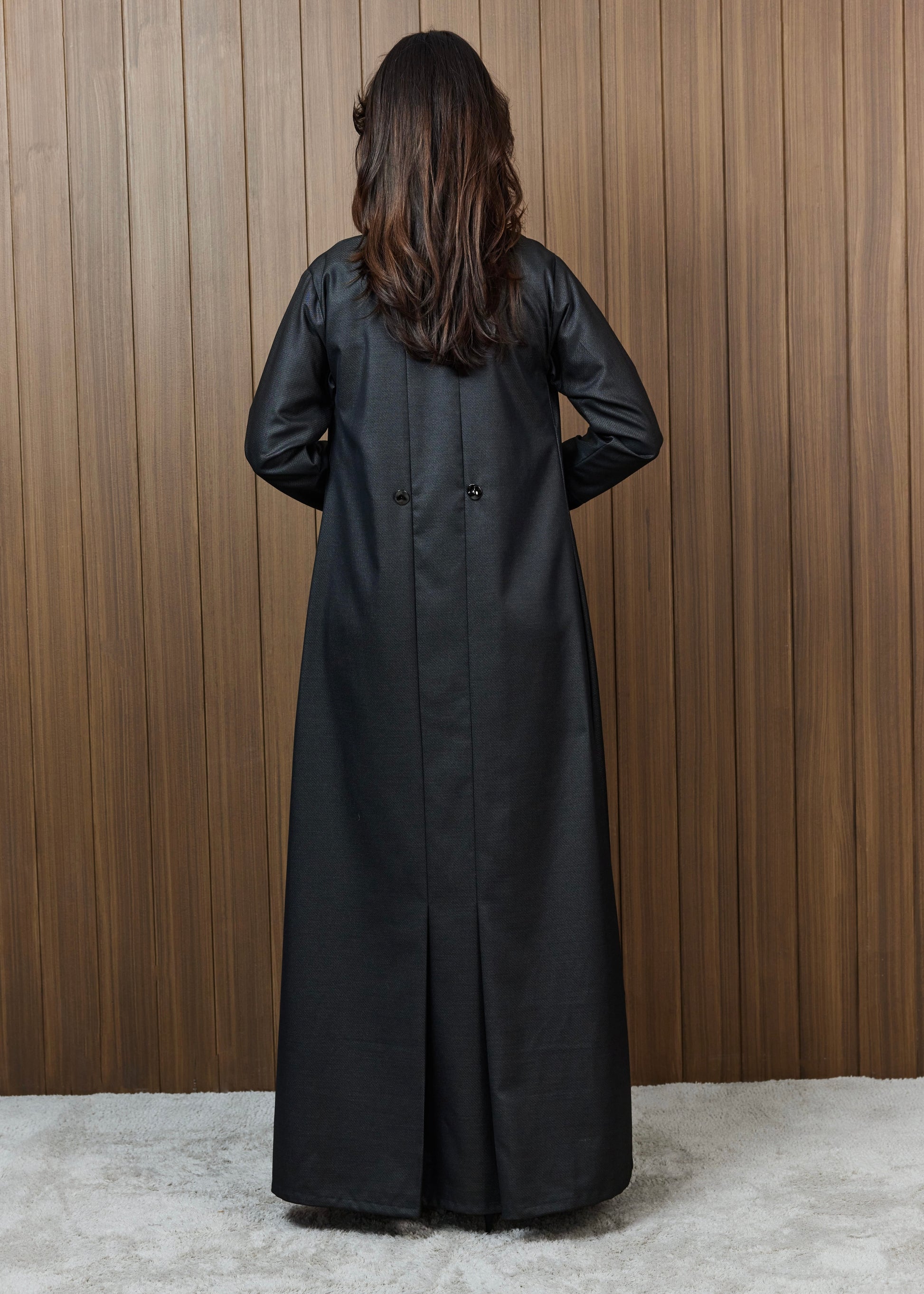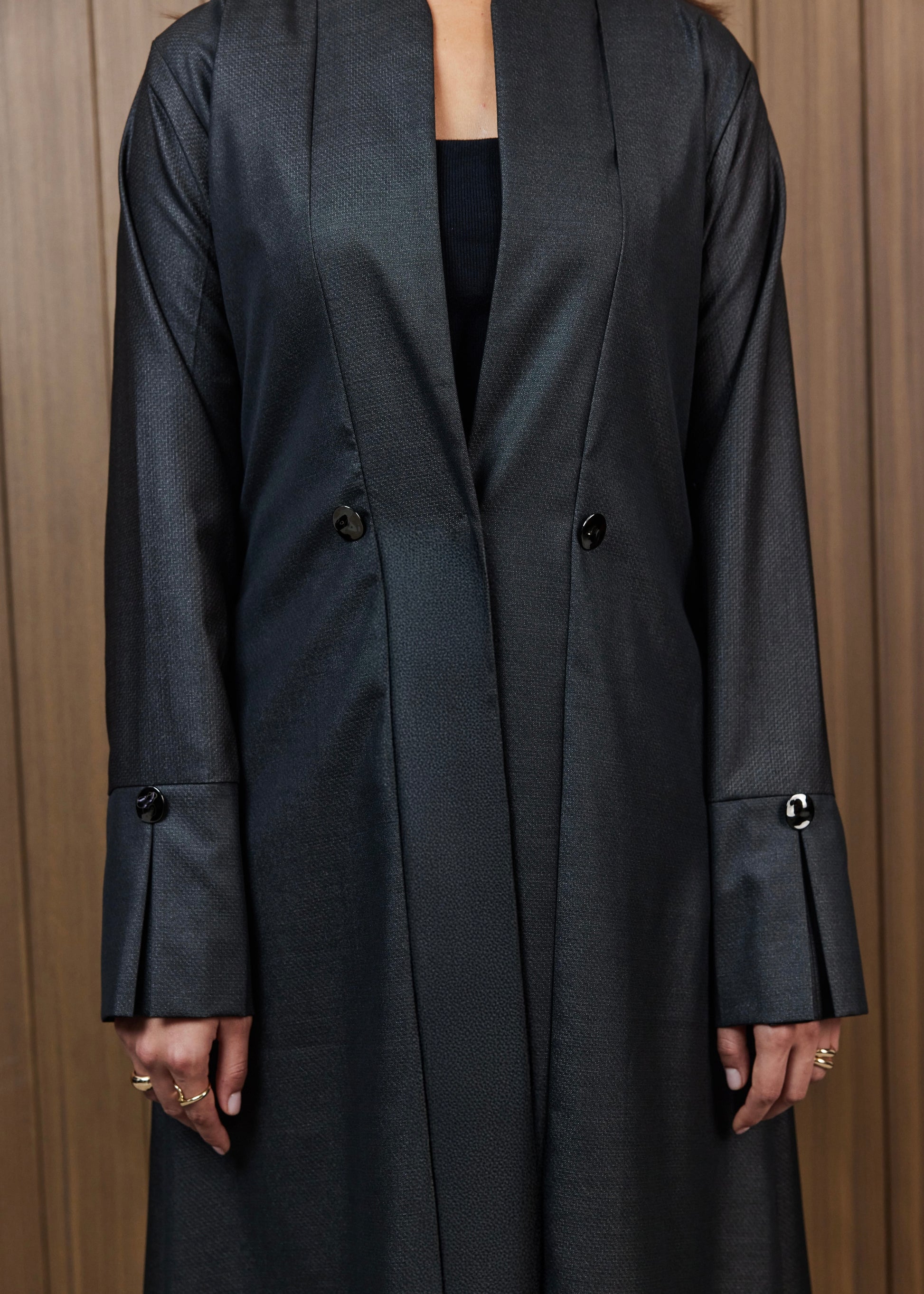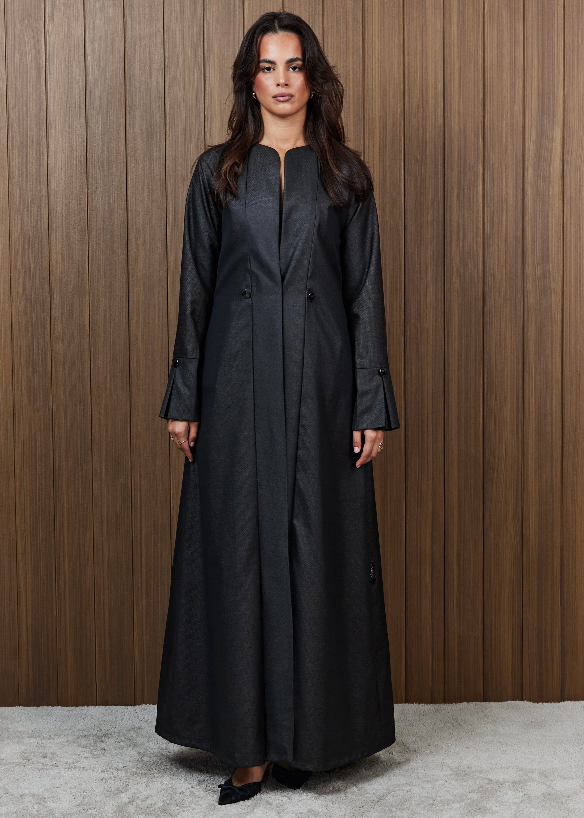 A sleek, structured abaya featuring clean lines and charcoal double-button detailing on the front, back, and hand cuffs, in a slightest A cut.