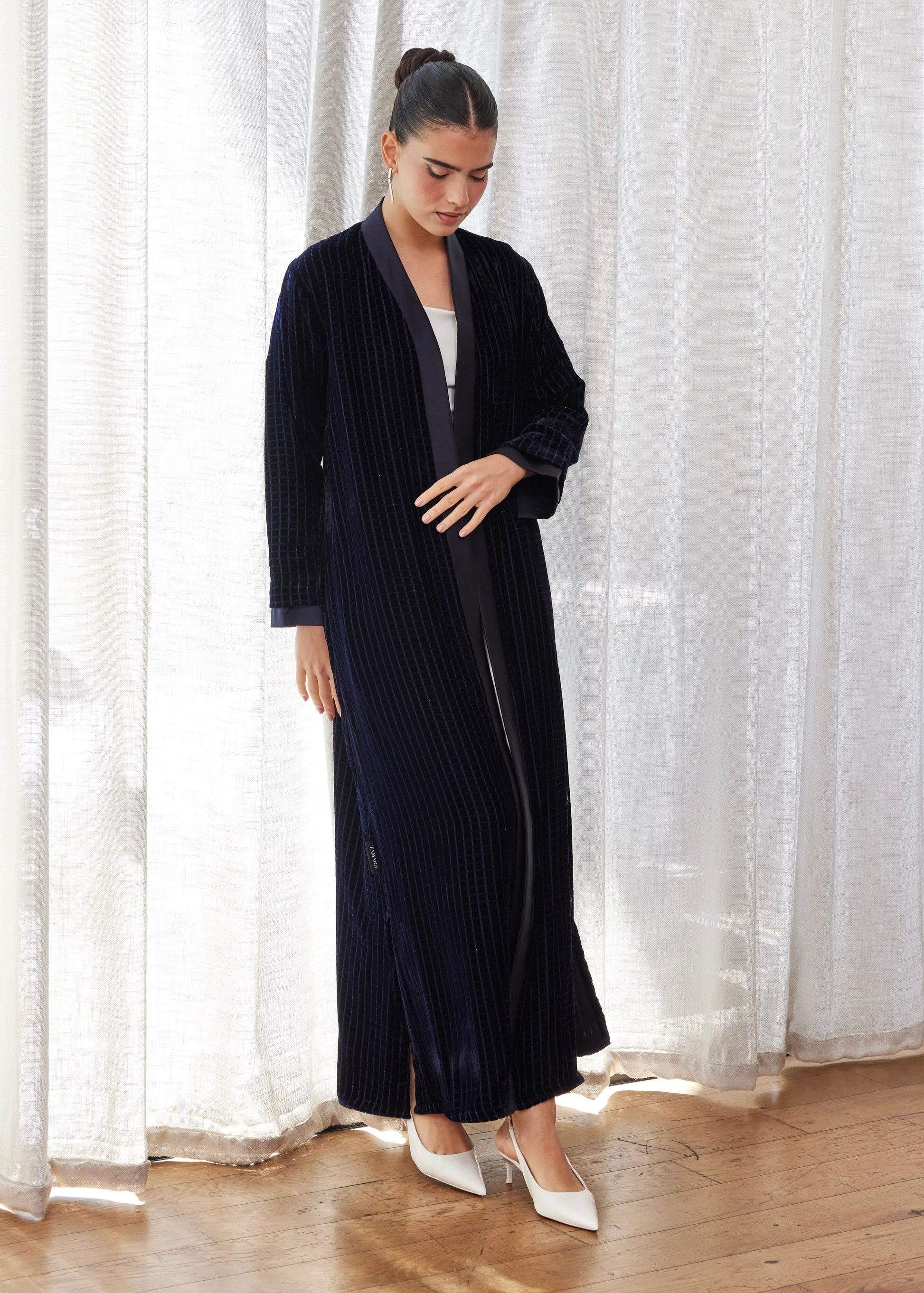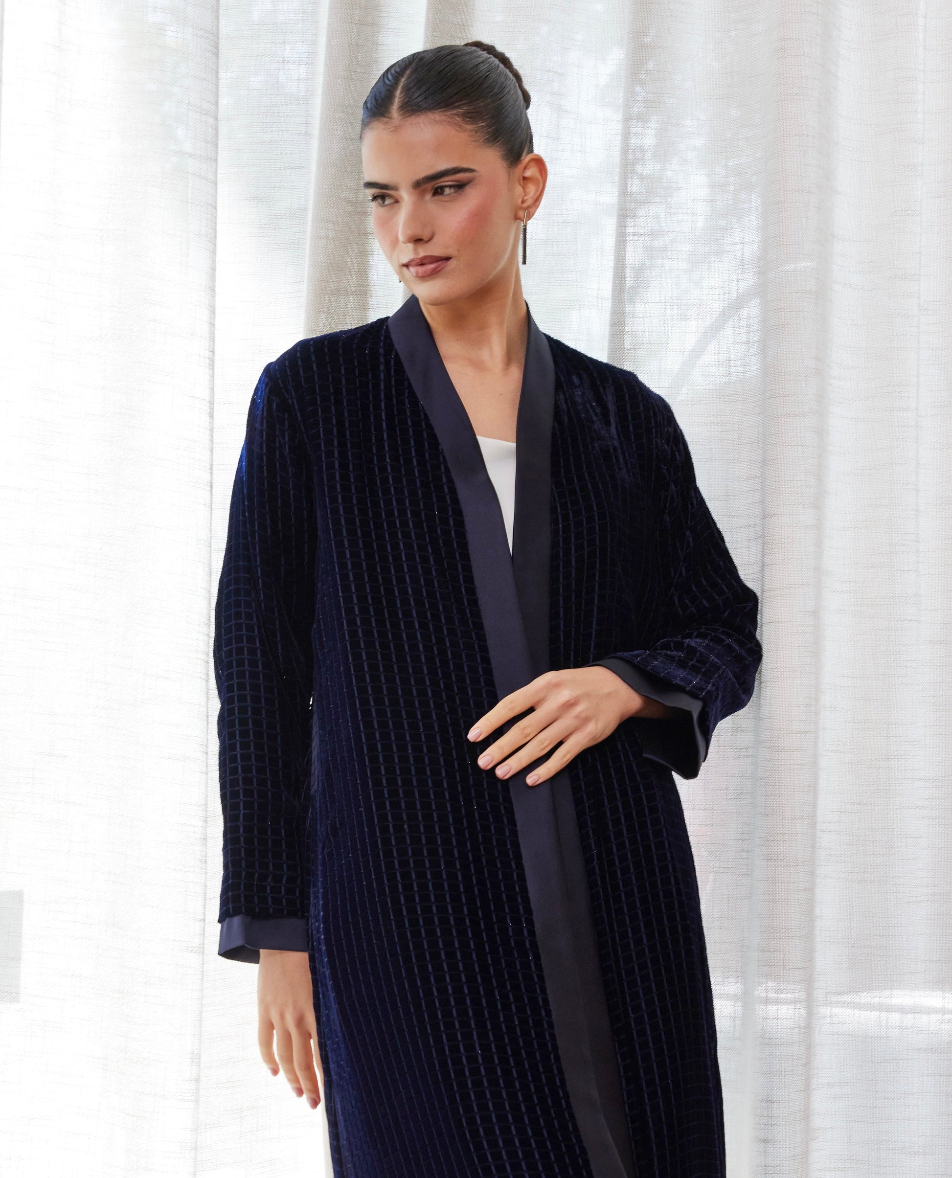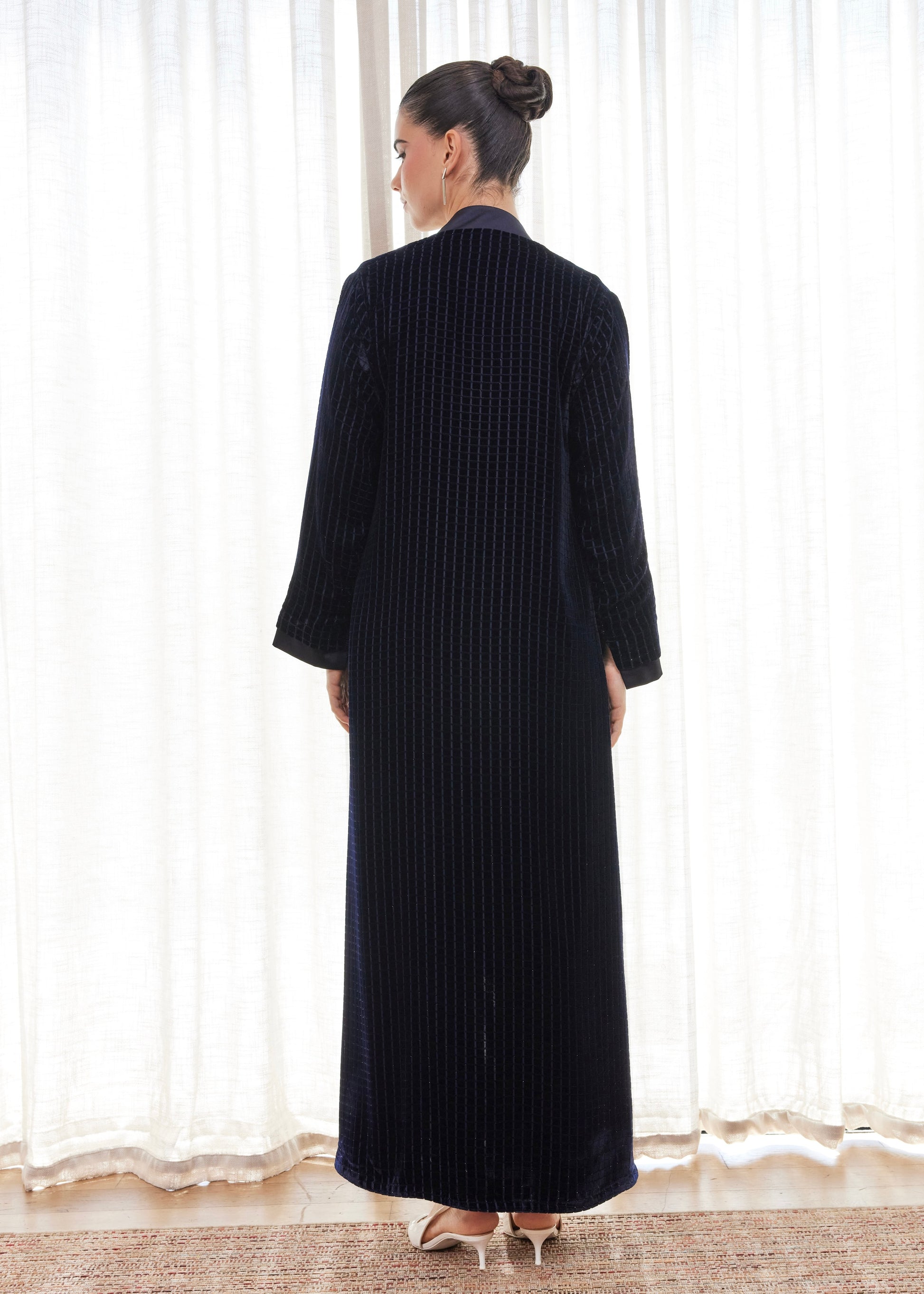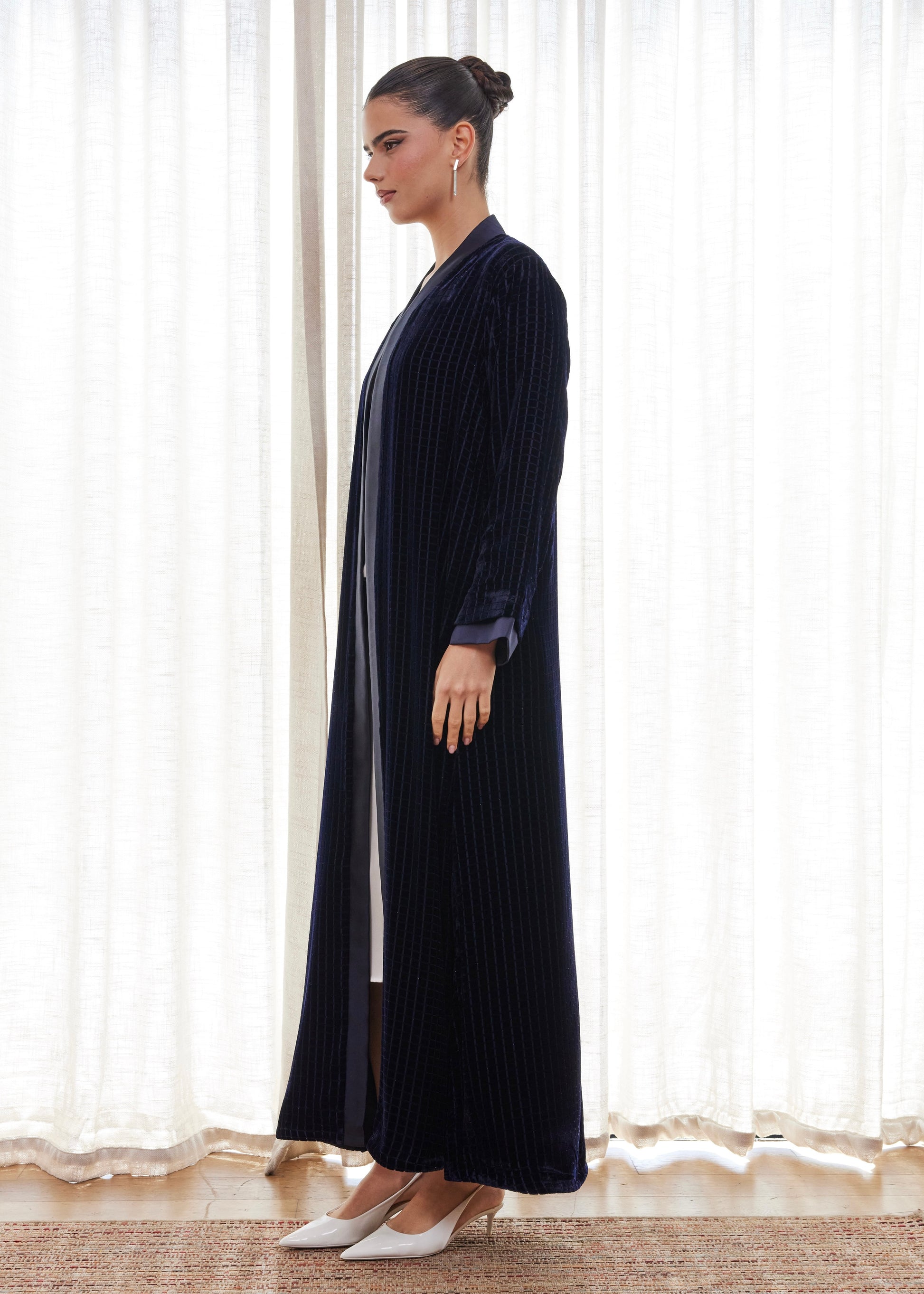 THE PERFECT BLEND OF VELVET AND SHINNY FABRIC IN NAVY BLUE, WITH A SILK NAVY BLUE TOUCH ON HAND AND FRONT SIDE TO ADD DETAILING TO THE FINAL LOOK
