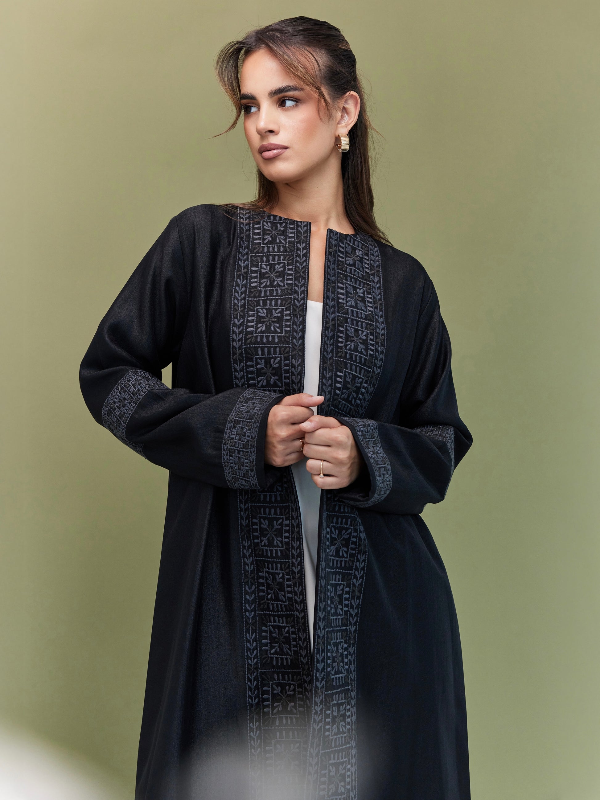 Soft taffeta fabric, Featuring embroidery in three closely blended shades on full front side and sleeves. in slight A cut