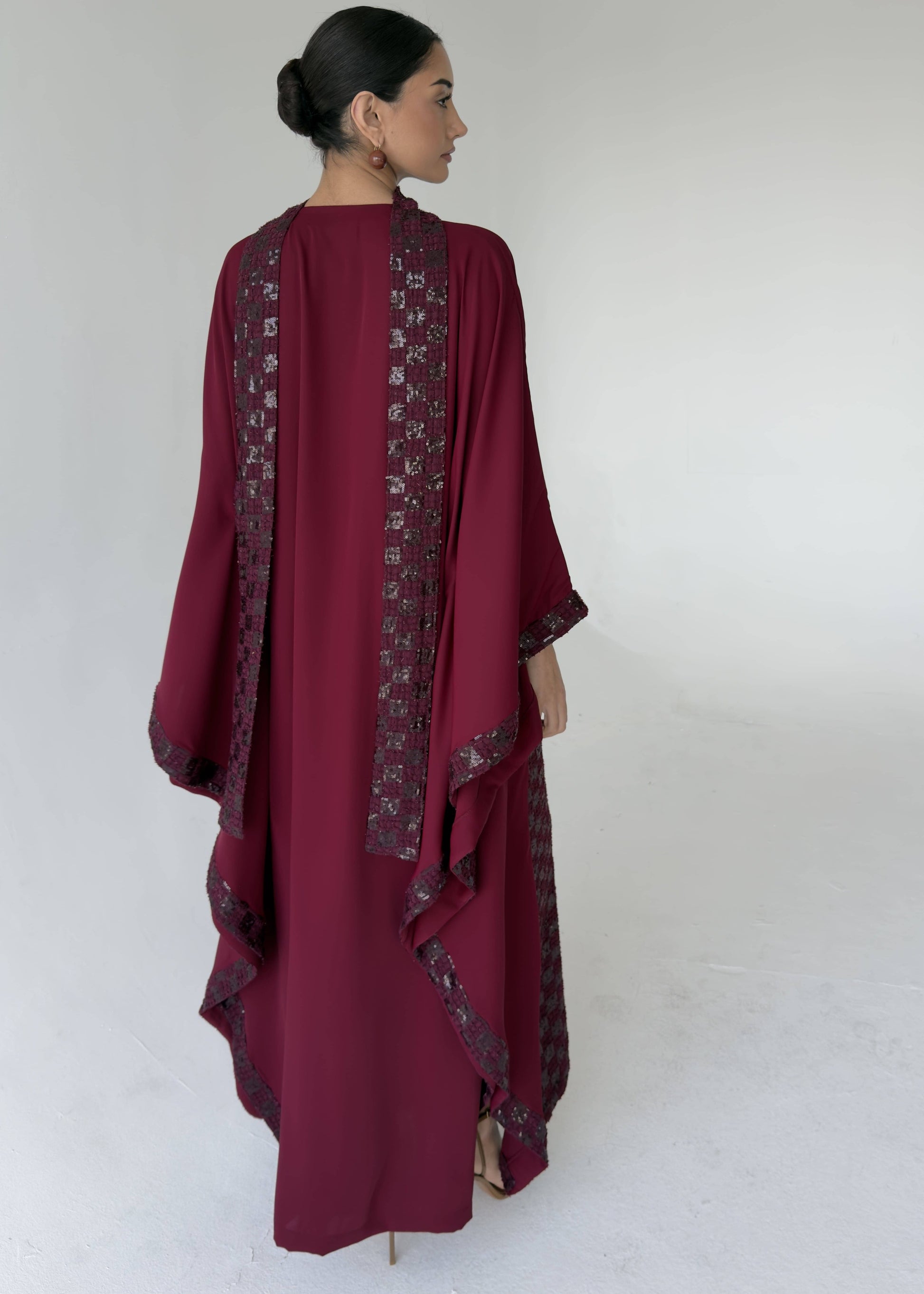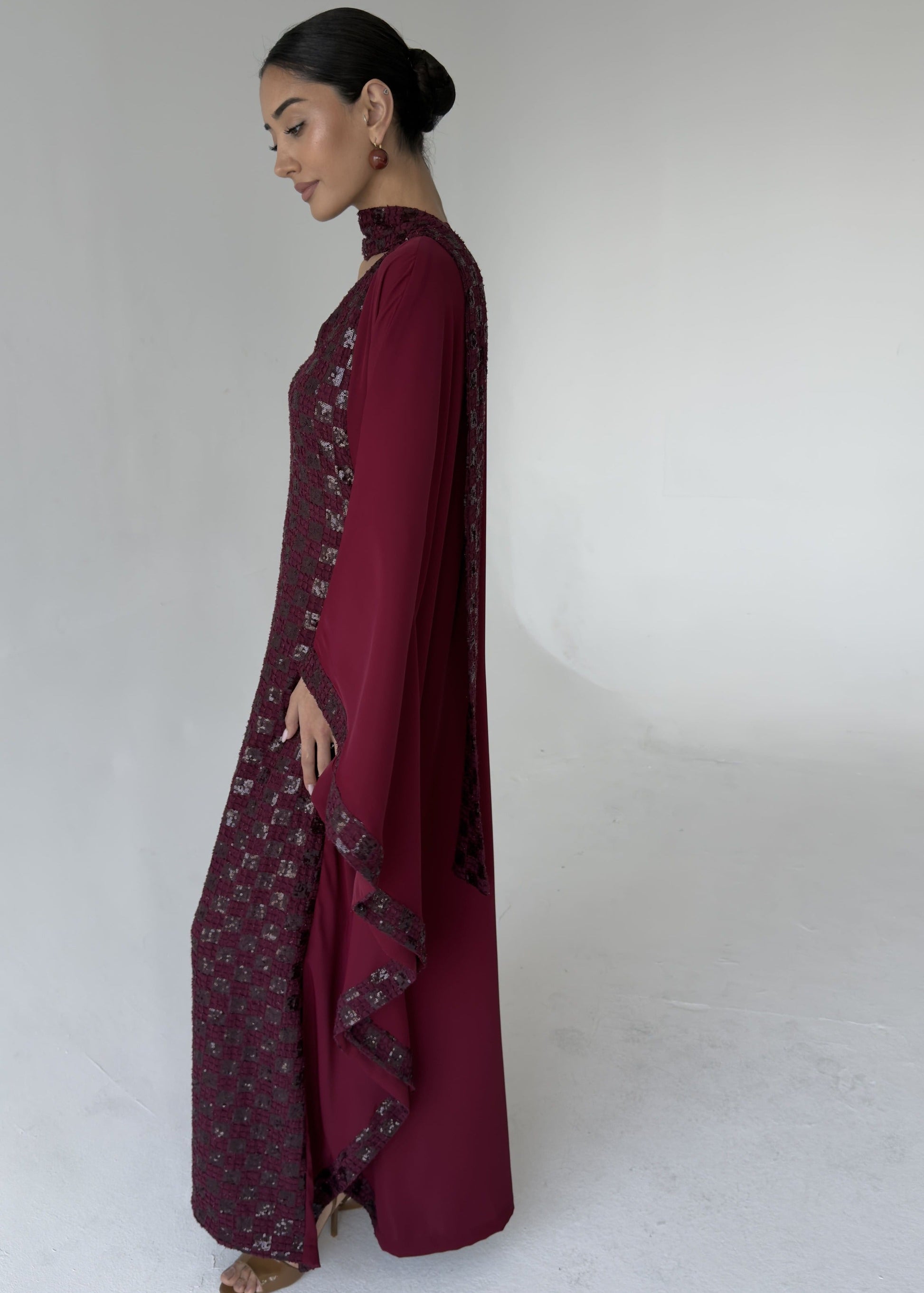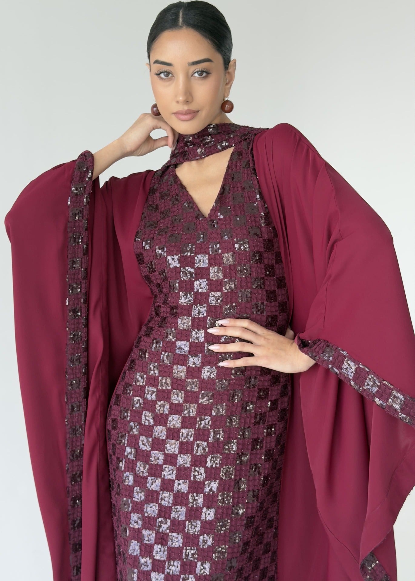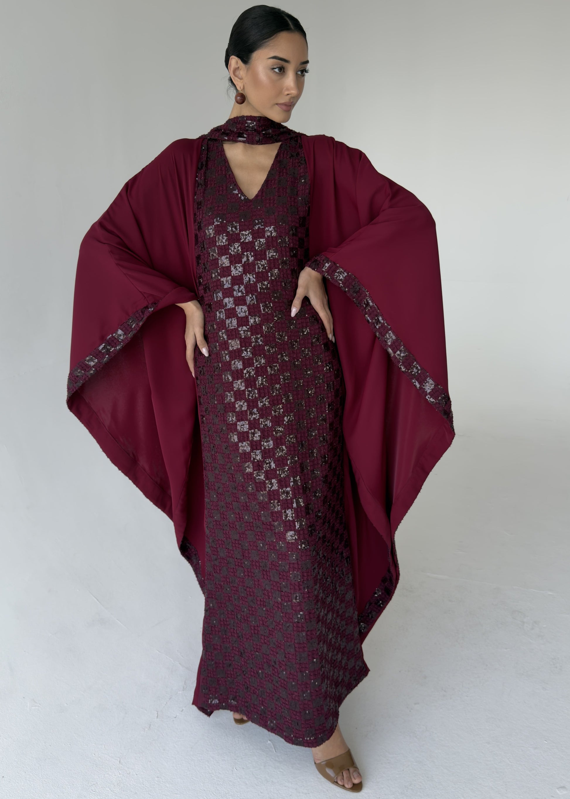 جلابية باللون الاحمر التوتي أنيقة بقصّة انسيابية، تتميّز بقماش مطرّز من الأمام مع قطعه من الكريب الناعم تنسدل من الخلف. يكتمل التصميم بأكمام واسعة بأسلوب الكيب، ، مع سكارف تمنح القطعة لمسة عصرية وأنثوية راقية