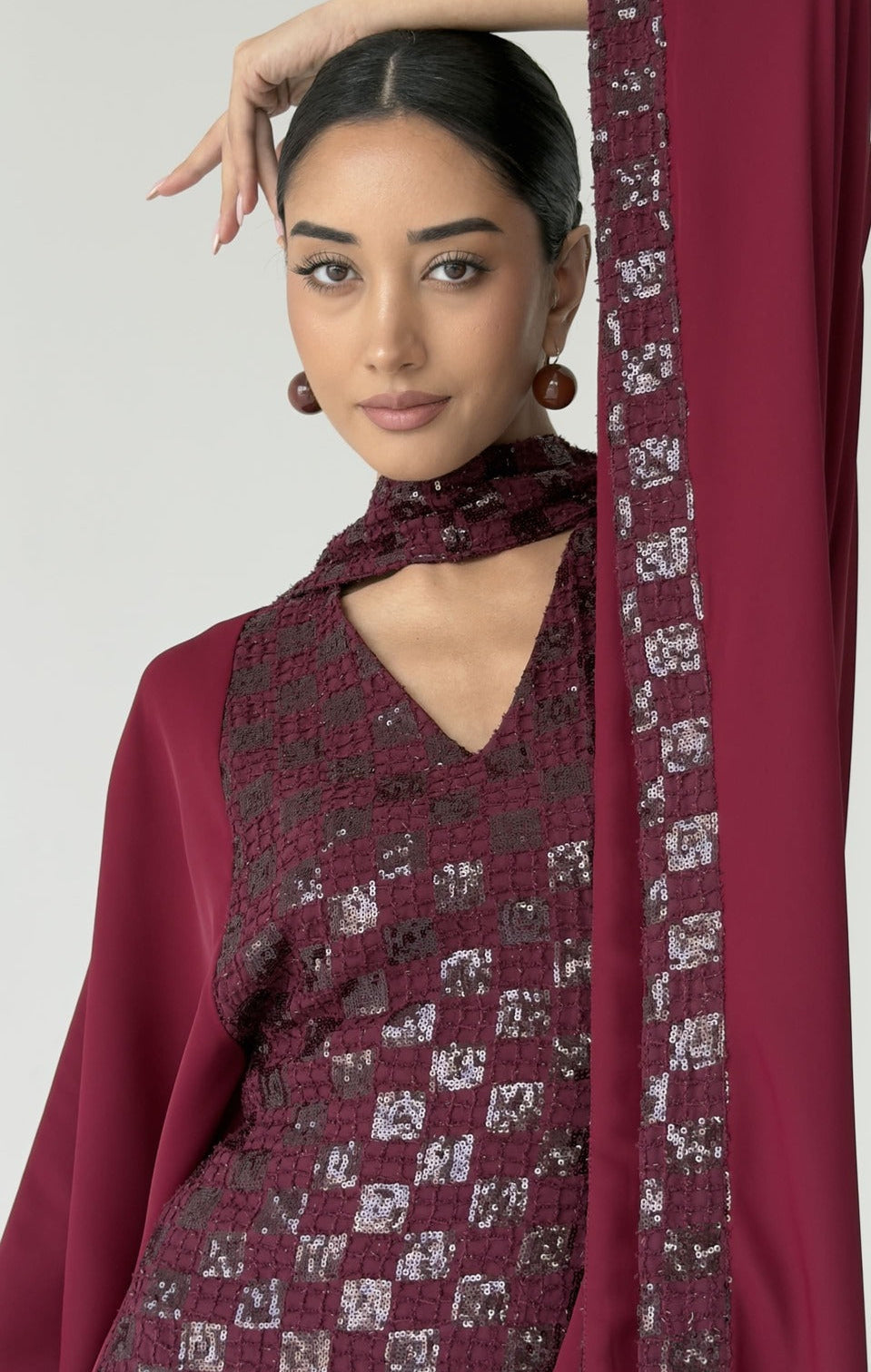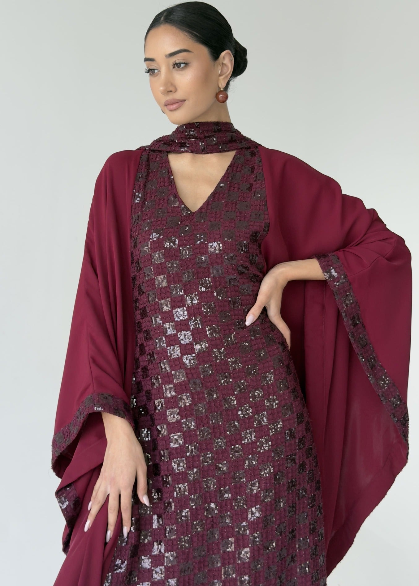 An elegant cherry red jalabiya crafted with a flowing silhouette. features embroidered floral fabric on the front, paired with soft crepe at the back. Wide cape-style sleeves, with a detachable scarf to complete the look with a modern, feminine finish